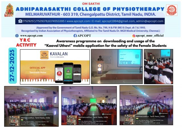 An awareness programme on downloading and effective usage of the “Kaaval Uthavi” mobile application was successfully conducted at Adhiparasakthi College of Physiotherapy (APCOPT) on 27-12-2025, with a special focus on ensuring the safety and security of female students.