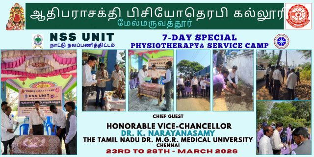 Our 7-Day Special Physiotherapy & Service Camp at Perperkandigai Village was successfully conducted with dedication and care towards community welfare. We were deeply honoured by the gracious visit of our Chief Guest, Dr. Narayanasamy, Vice Chancellor, The Tamil Nadu Dr. M.G.R. Medical University, Chennai.