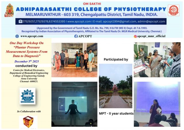 On 05-12-25, our MPT students actively participated in a one-day workshop conducted by Anna University, Chennai, focusing on the Plantar Pressure Measurement System.
